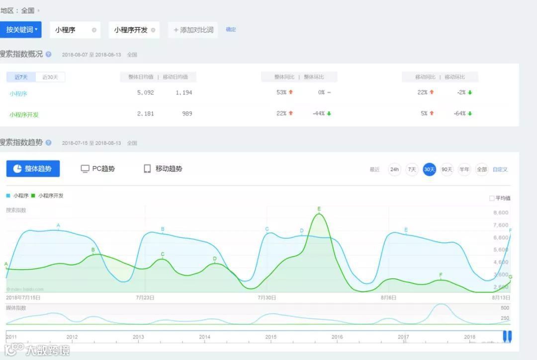 以小程序为例,百度指数显示:在小程序相关的搜索词中,“小程序开发”的搜索热度仅次于“小程序”,也就是说,现在市场已经对小程序非常认可,很多企业、商户、个人都想要做一个自己的小程序,更重要的是,这些人没有周围没有可以帮他做小程序的人,所以他只能通过上网找。