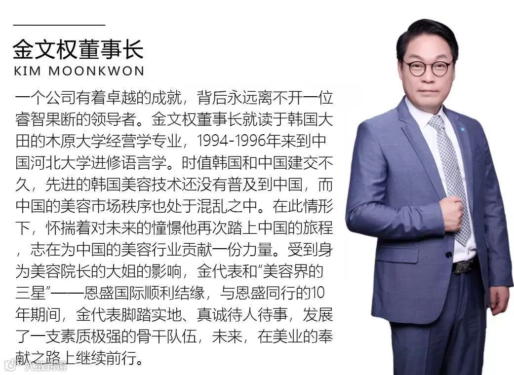 恩盛国际是研发生产科技美容仪器和高机能性护肤品的著名韩国企业。自1995年以来一直致力于研发创新的技术、制造高级的品质、生产科技型领先产品,拥有所研发仪器的外观专利,制药必须的GMP认证,多种项目的特许证书。在中国科技美容领域占有率和满意度排名遥遥领先。