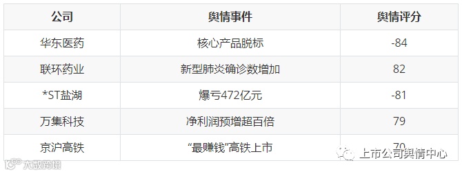 公司层面来看,新一轮带量采购到来,华东医药核心产品脱标,股价闪崩;肺炎疫情有所扩散,相关个股股价表现强势;*ST盐湖爆亏472亿元,打破A股亏损记录;万集科技归属上市公司净利润同比预增超百倍,股价却一度闪崩跌停。