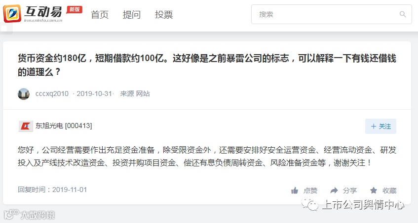 10月31日,有投资者在互动易平台上向东旭光电提问,要求说明有钱还借钱的道理。