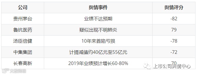 上市公司方面,根据中国上市公司舆情中心数据显示,近一周(2019年12月30日-2020年1月5日)舆情热度最高的前5事件分别是: