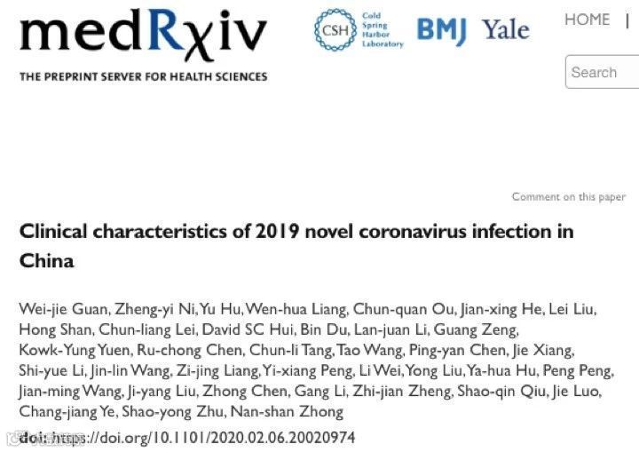2月9日,由国家卫健委高级别专家组组长、中国工程院院士钟南山领衔的“中国2019年新型冠状病毒感染的临床特征”研究,在预印本网站medRxiv上发表。(注:medRxiv的论文均未经同行评审)