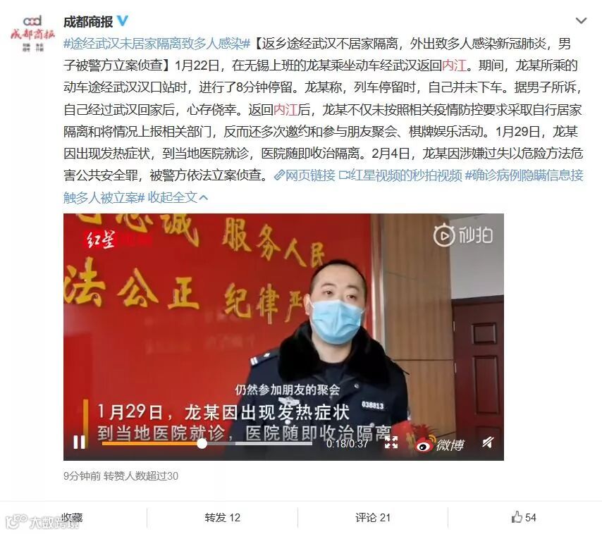 据内江广播电视台报道,内江籍男子龙某,因1月22日经过武汉回家后,心存侥幸,不仅未按照相关疫情防控要求,还邀约和参与朋友的邀约,参加聚会、棋牌娱乐活动等,从而导致疫情扩散,现涉嫌以过失危险方法危害公共安全罪,被警方依法立案侦查。