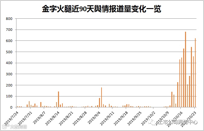 据中国上市公司舆情中心数据显示,自蹭上人造肉概念后,金字火腿的报道量暴涨,并由于随后的减持及被问询,舆论关注度一直居高不下。其中,《北京商报》、《新京报》以及《长江商报》等多家媒体就暴涨后减持一事做深入报道和质疑。