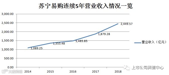 据WIND统计,2014到2018年,苏宁易购营业收入和净利润连续5年上涨,其中净利润从8.67亿元涨至133.28亿元,但扣除非经常性损益后的净利润连续5年为负。换句话说,苏宁易购的主业连续5年处于亏损状态。