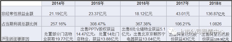 由于频频变卖资产,苏宁易购的非经常损益项目金额高居不下,从2014年至2018年的5年间,苏宁易购非经常性损益金额始终在10亿元以上,其中2018年更是高达136.87亿元,这也是企业净利润为何如此靓丽的真实原因。其中2014年卖门店获益19亿元;2015年卖门店获益13亿元、卖PPTV股权获益14亿元;2016年卖仓储获益5亿元、卖子公司京朝苏宁电器获益13亿元;2017年卖阿里巴巴股份获益约43亿元;2018年卖阿里巴巴股份获益约139亿元。