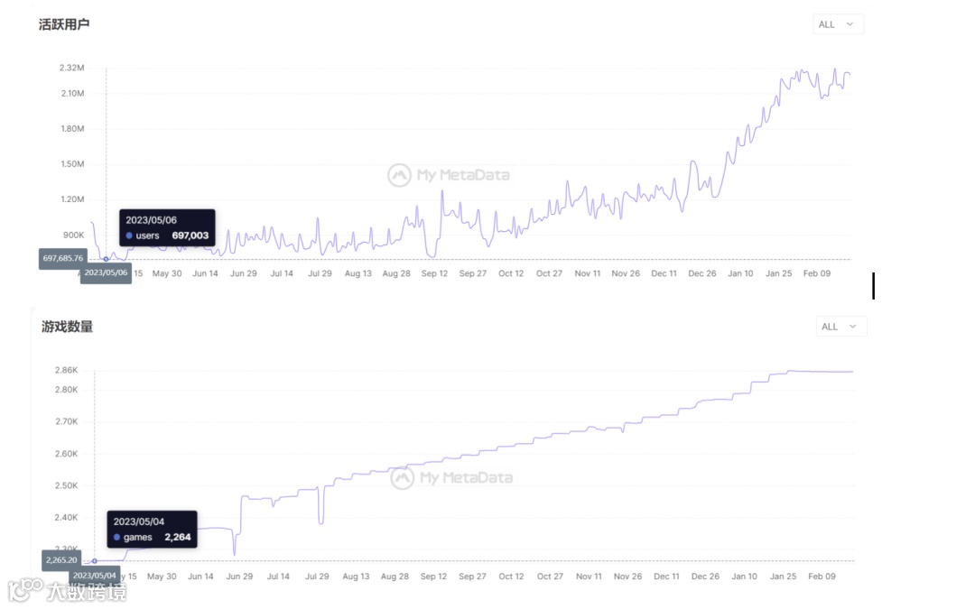 据链游平台My Meta Data数据显示,从2023年5月份以来,链游赛道的活跃用户量就一路上涨,约从70万涨至220万,涨幅高达214%。而游戏数量则从2300涨至2800,涨幅约为21.73。