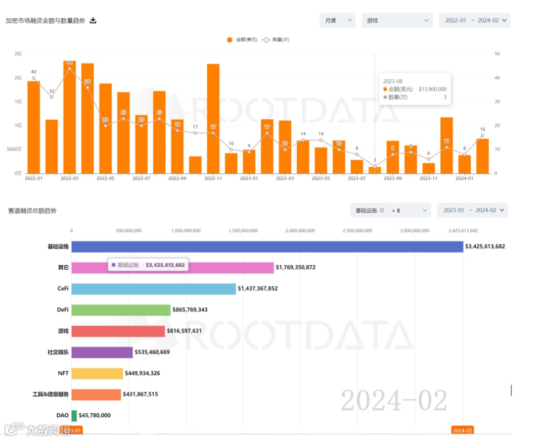 融资方面,从RootData数据可以看出,游戏赛道融资数量和额度在2023年下半年均有所回升。并且融资总额排名仅次于DeFi赛道。