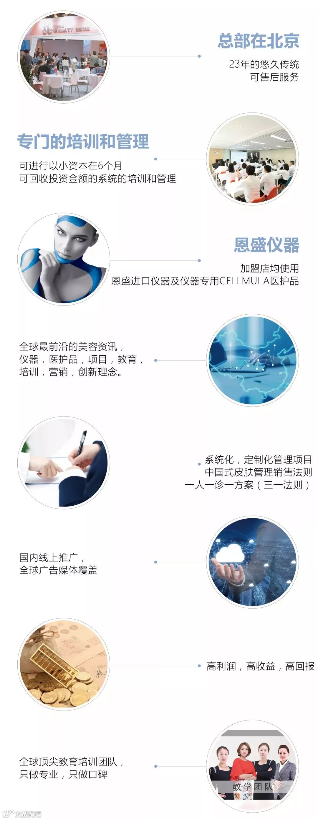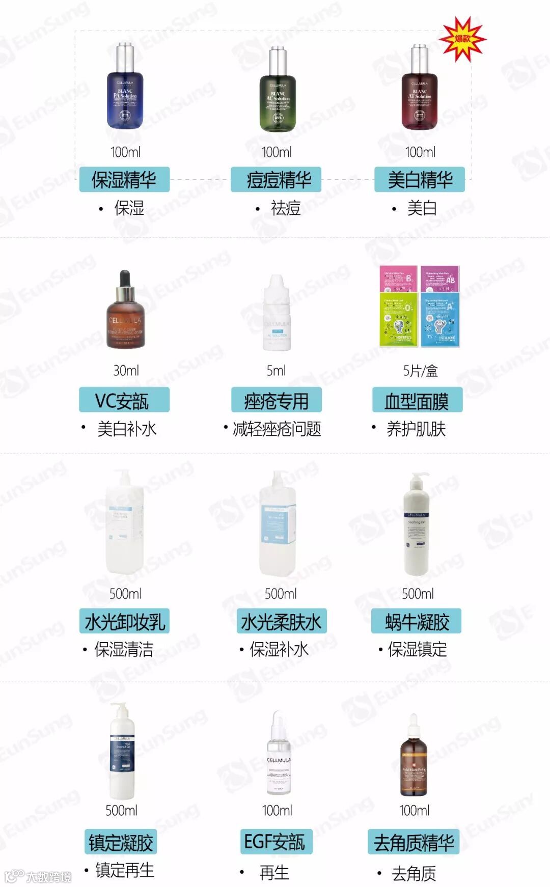 恩盛EUNSUNG是一家集开发、研制、生产、销售、维修、培训、加盟为一体的专业性美业龙头企业。公司主营美容设备生产、医护品及皮肤管理加盟等三大领域。恩盛所生产的高科技美容仪器享誉世界;cellmula赛尔芙雅医护品针对苦恼的肌肤问题,通过特殊工艺打造出有效呵护肌肤的健康医护品