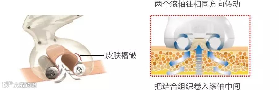 利用两个滚轴的强力,持续拉伸结合组织,形成皮肤褶皱