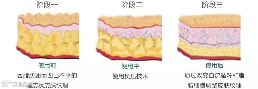 利用真空吸入作用,使物理性压力直达皮肤深层脂肪层,从而实现缓解和调整脂肪团的根 本原因—纤维变性组织。