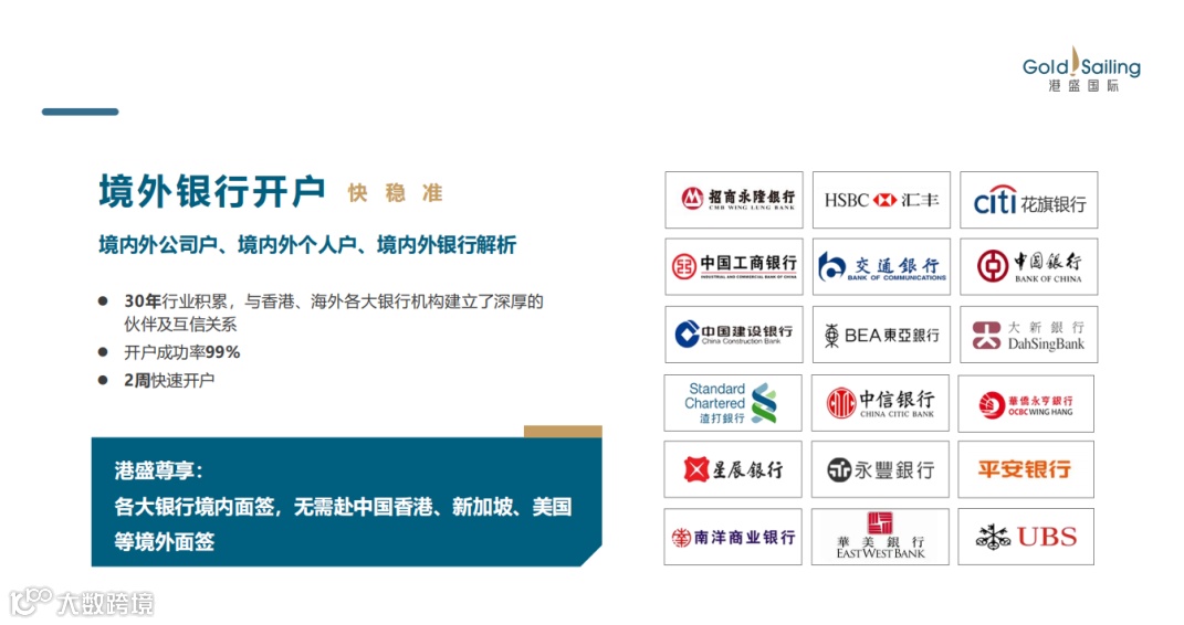 港盛国际是香港汇丰、恒生、渣打、中银、东亚、交通、华侨、大新等多家知名银行认可的战略合作伙伴,覆盖中国、香港、新加坡、英国、美国、瑞士、塞浦路斯等地的广泛开户网络。凭借丰富的经验和专业的服务,银行开户成功率高。