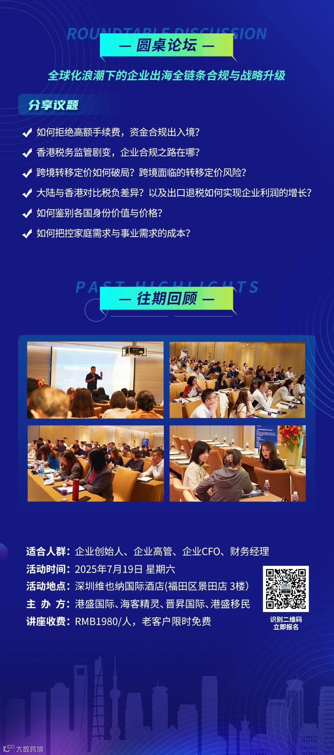 7月19日深圳维也纳国际酒店(福田区景田店3 楼),港盛国际将携手业界伙伴,带来 「出海战略・离岸操作」专题讲座,聚焦对等关税下企业出海新模式,从大势洞察到战略规划,从落地实操到长效护航,全维度拆解出海痛点与破局路径 。