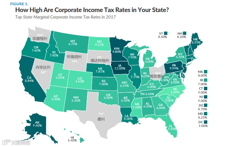 没有企业所得税的州包括内华达州、德州、华盛顿州、俄亥俄州、南达科他州和怀俄明州。