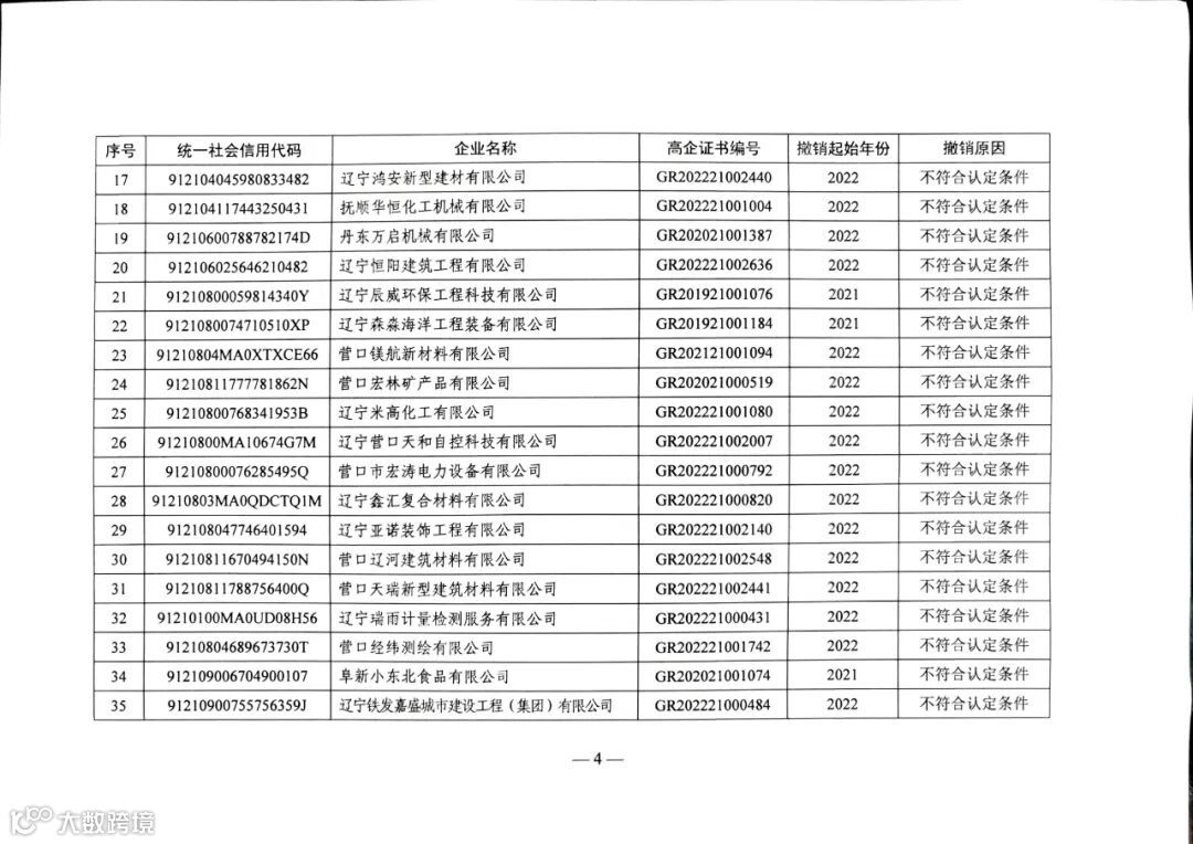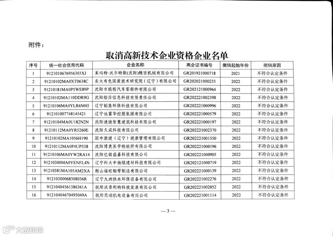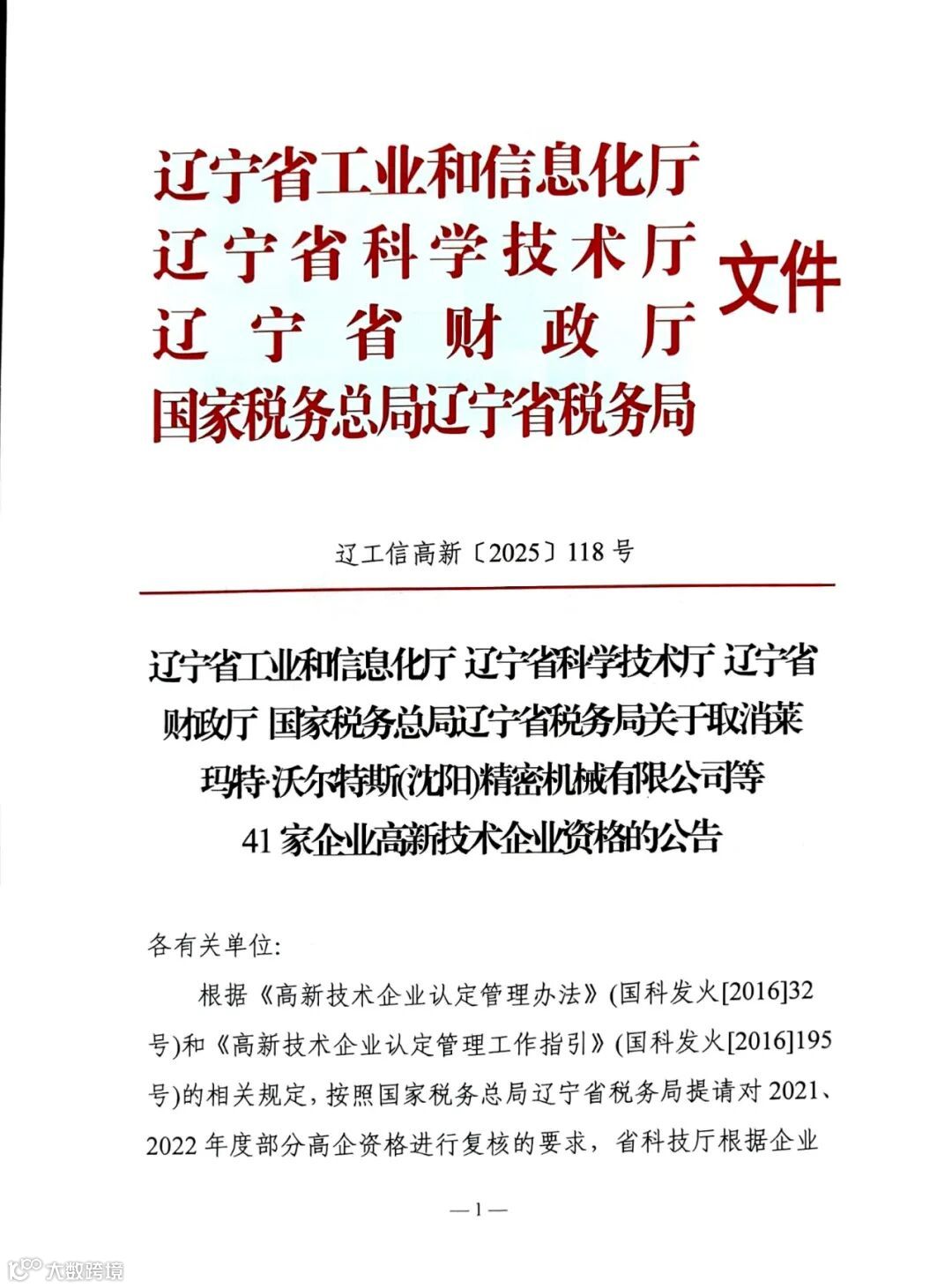 快讯|辽宁省认定机构:关于取消莱玛特·沃尔特斯(沈阳)精密机械有限公司等41家企业高新技术企业资格的公告