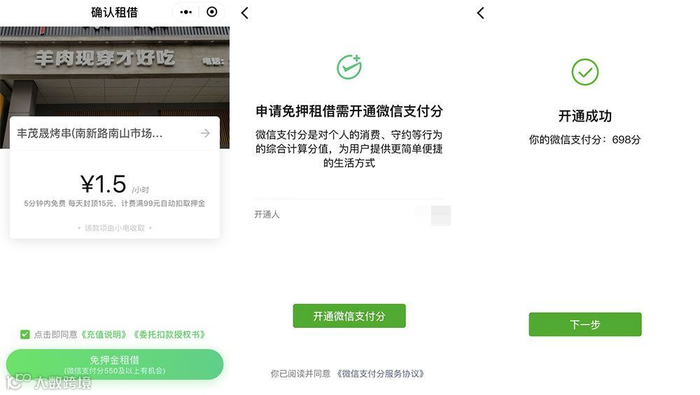 在深圳扫描小电充电的小程序码,便可进入租借共享充电宝的界面。根据提示,可以有交押金和利用微信支付分免押两种方式租借。选择免押金租借后,小程序接入微信支付分,达到 550 分以上即可免押。