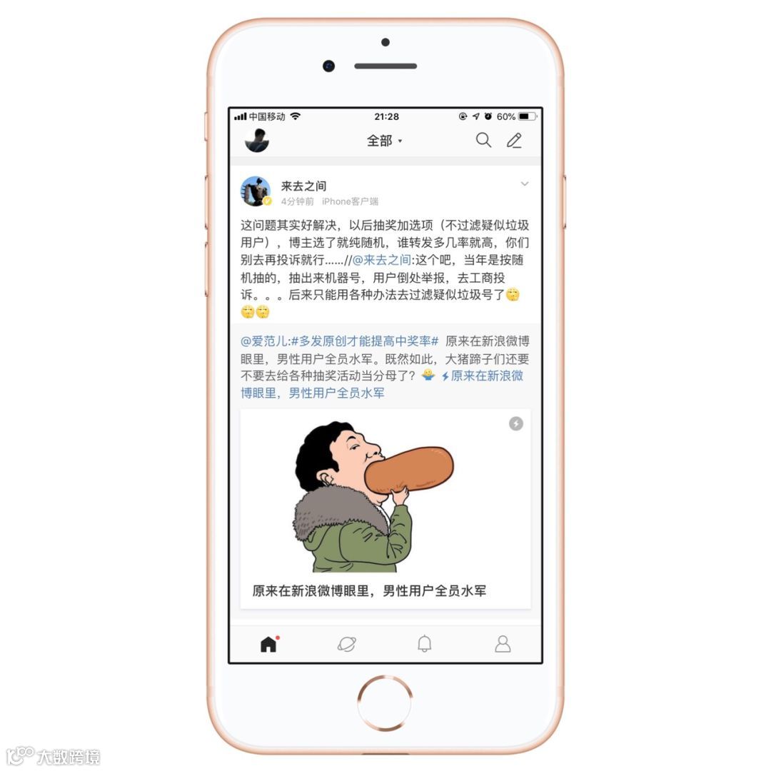 ● 微博 CEO 回复王思聪抽奖活动质疑:重点不在于性别。针对王思聪抽奖活动后的质疑,微博CEO王高飞回复称:重点不在于性别,而在于活跃度。女生就是活跃度高,有啥办法?同时他表示,当年抽奖是按随机抽的,抽出来机器号,用户到处举报,去工商投诉。后来只能用各种办法去过滤疑似垃圾号了。