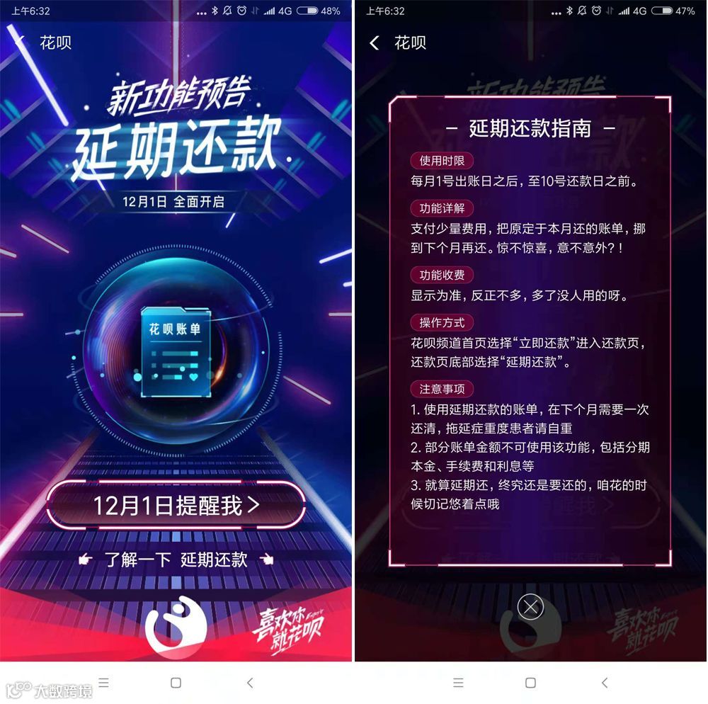 ● 花呗将上线延期还款功能。花呗在支付宝 app 预告了即将上线的延期还款功能。据预告信息,延期还款功能将于 12 月 1 日全面开启。延期还款指南显示,该功能可在每月 1 号出账日之后至 10 号还款日之前使用。使用该功能,需要支付少量费用,即可把原定于本月还的账单挪到下个月还。