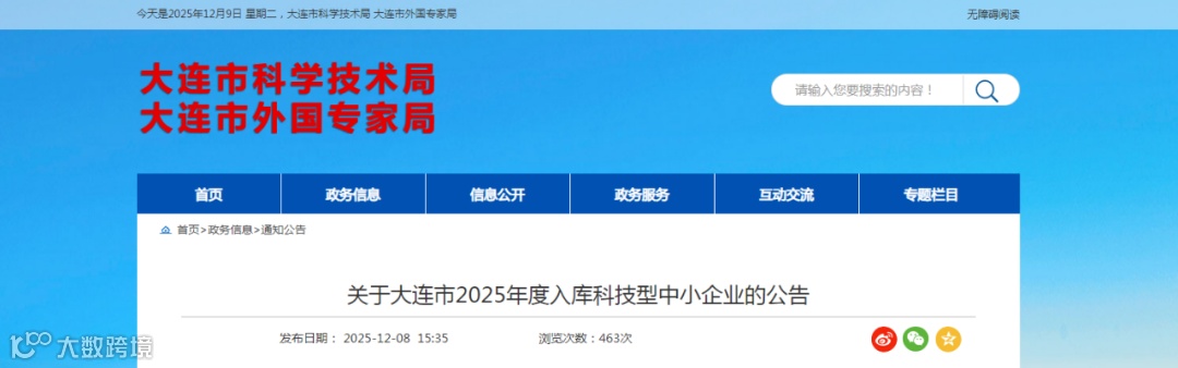 根据《科技型中小企业评价办法》(国科发政〔2017〕115号)和《科技型中小企业评价服务工作指引》(国科火字〔2022〕67号)要求,大连市2025年拟入库企业经公示、异议核实,有1家企业不符合科技型中小企业入库条件。现将通过公示的大连市2025年1431家入库科技型中小企业名单(详见附件)予以公告。