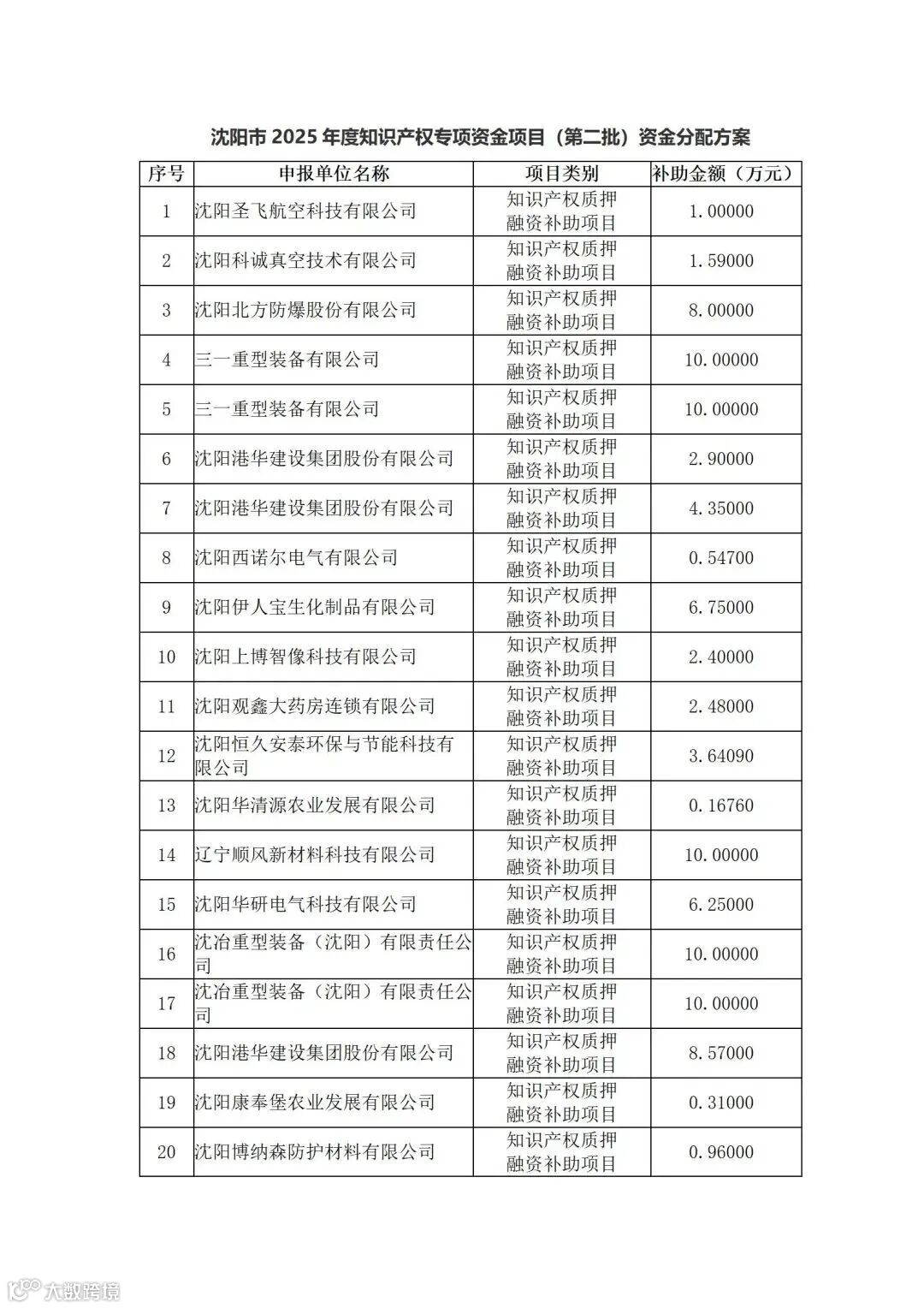 附件:沈阳市2025年度知识产权专项资金项目(第二批)资金分配方案
