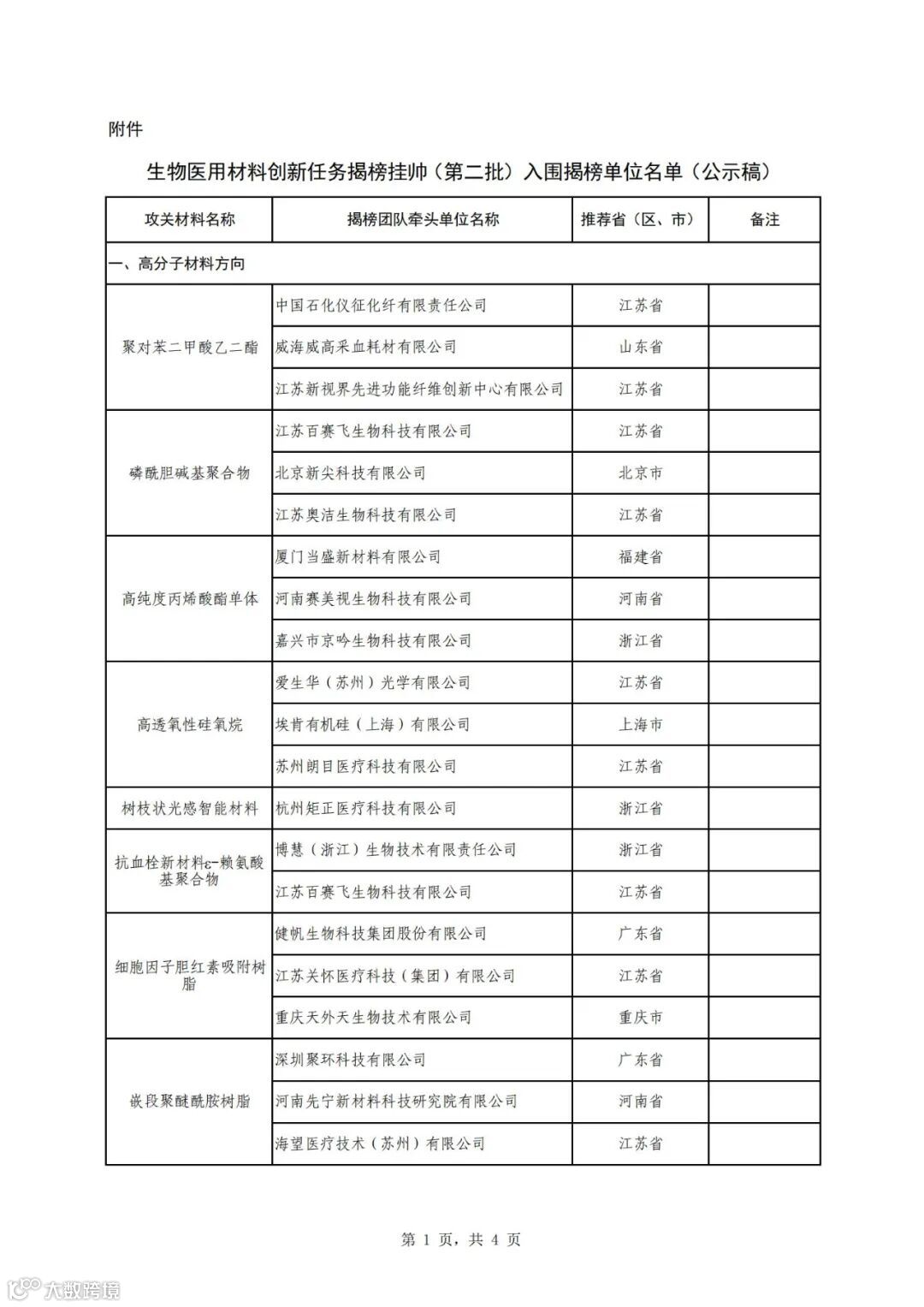 附件:生物医用材料创新任务揭榜挂帅(第二批)入围揭榜单位名单(公示稿)