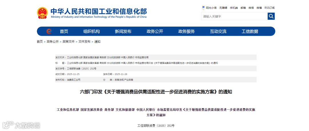 为贯彻落实党中央、国务院关于大力提振消费的决策部署,工业和信息化部等六部门制定了《关于增强消费品供需适配性进一步促进消费的实施方案》,经国务院同意,现予印发,请认真组织实施。