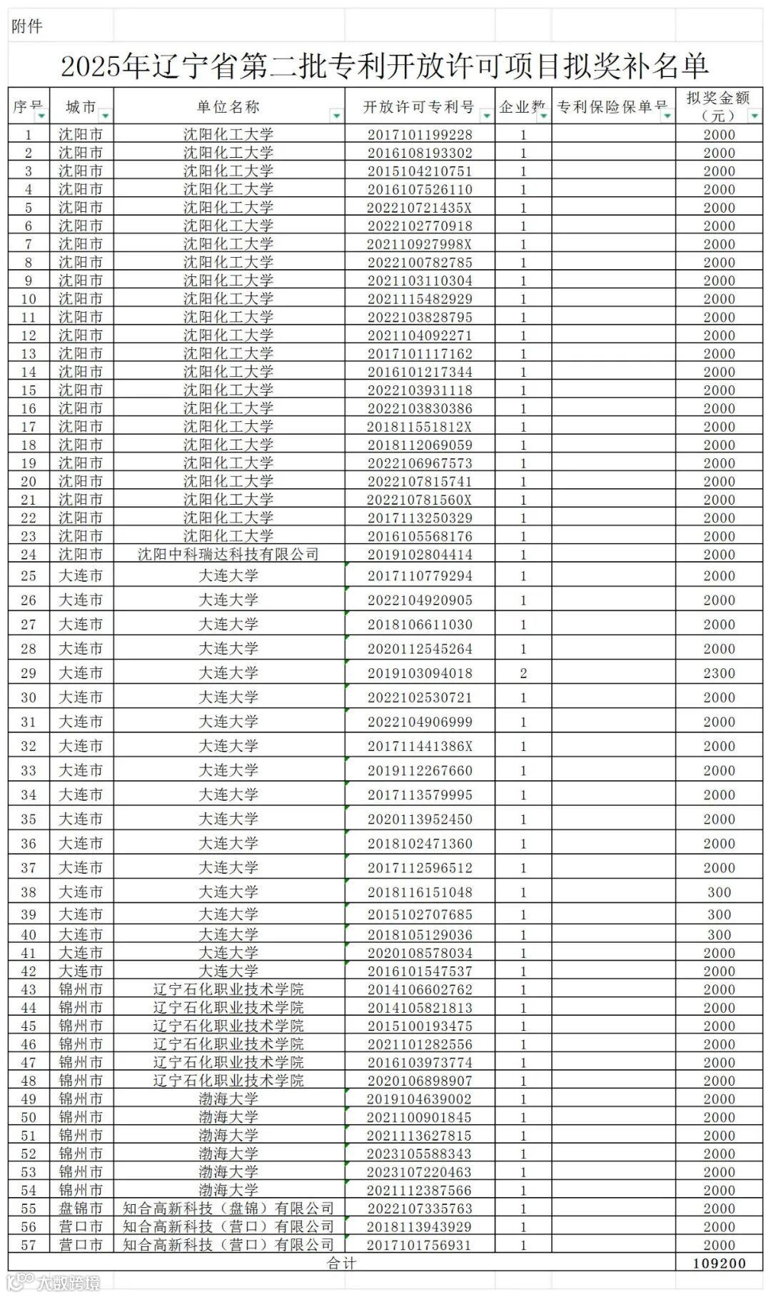 附件:2025年辽宁省第二批专利开放许可项目拟奖补名单