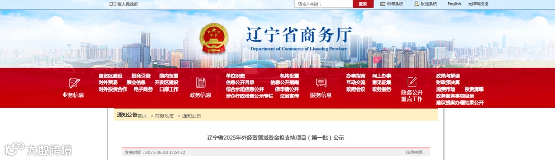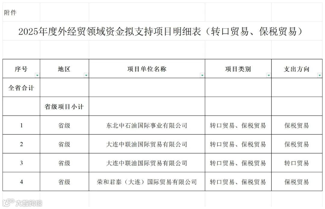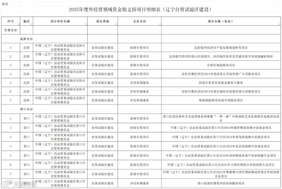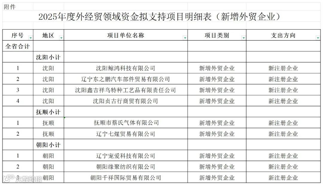 根据《关于印发辽宁省2025年度外经贸领域资金项目实施方案的通知》(辽商财〔2025〕19号)等有关规定,经企业申报、各市初审、第三方机构评审,我们确定了辽宁省2025年度外经贸领域资金部分拟支持项目(详见附件),现予以公示,接受社会监督。