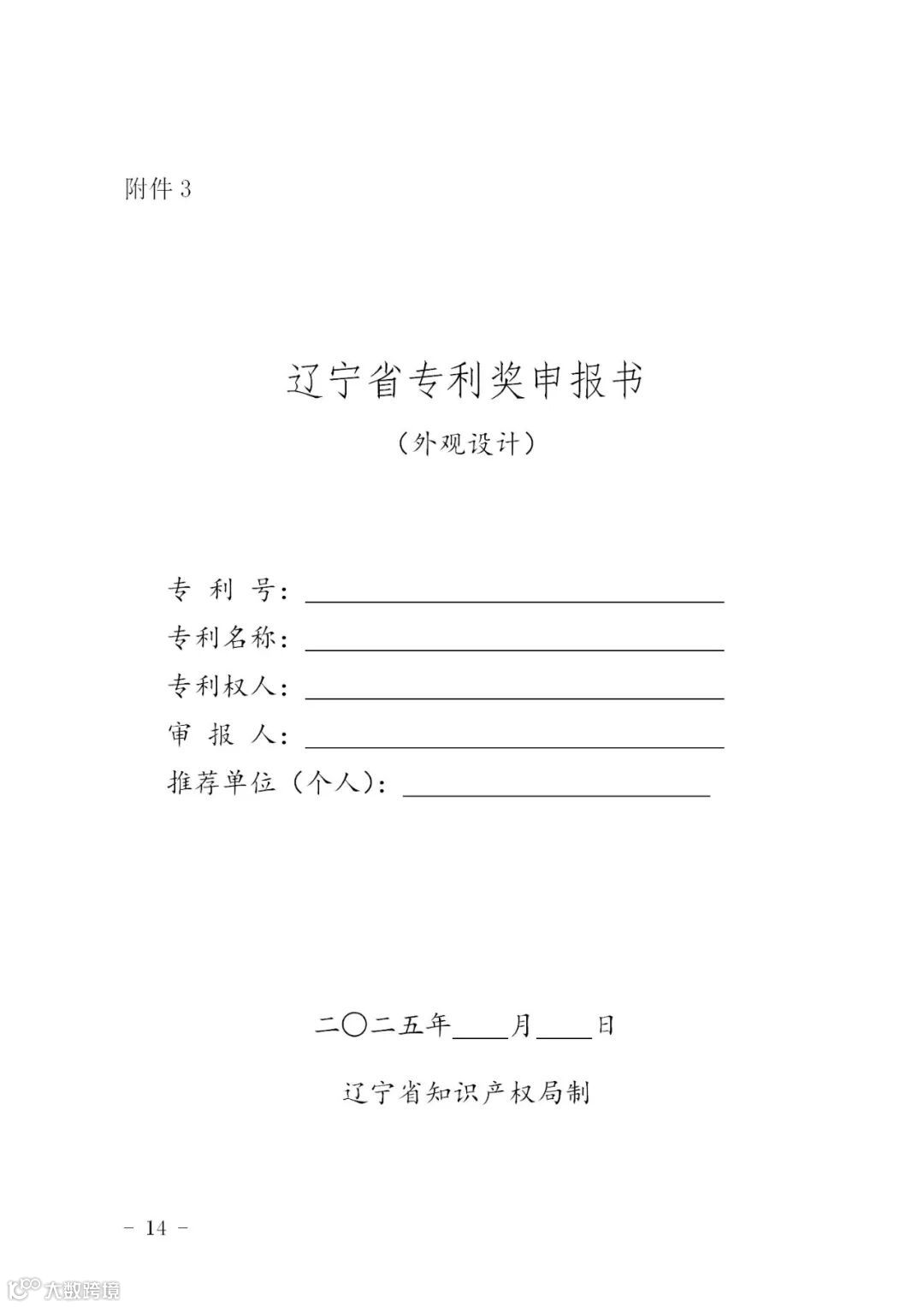 为加快推进知识产权强省建设,激发全社会创新活力,根据《党和国家功勋荣誉表彰工作委员会办公室关于评比表彰项目事项的函》(功勋办〔2024〕158号)、《评比表彰和创建示范活动管理办法》、《辽宁省功勋荣誉表彰工作领导小组办公室《关于2025年度省级表彰计划的批复》(辽功勋办函〔2025〕5号)、《辽宁省专利奖励办法》和《辽宁省专利奖励办法实施细则》有关规定,现组织开展第四届辽宁省专利奖评选工作,具体事项通知如下: