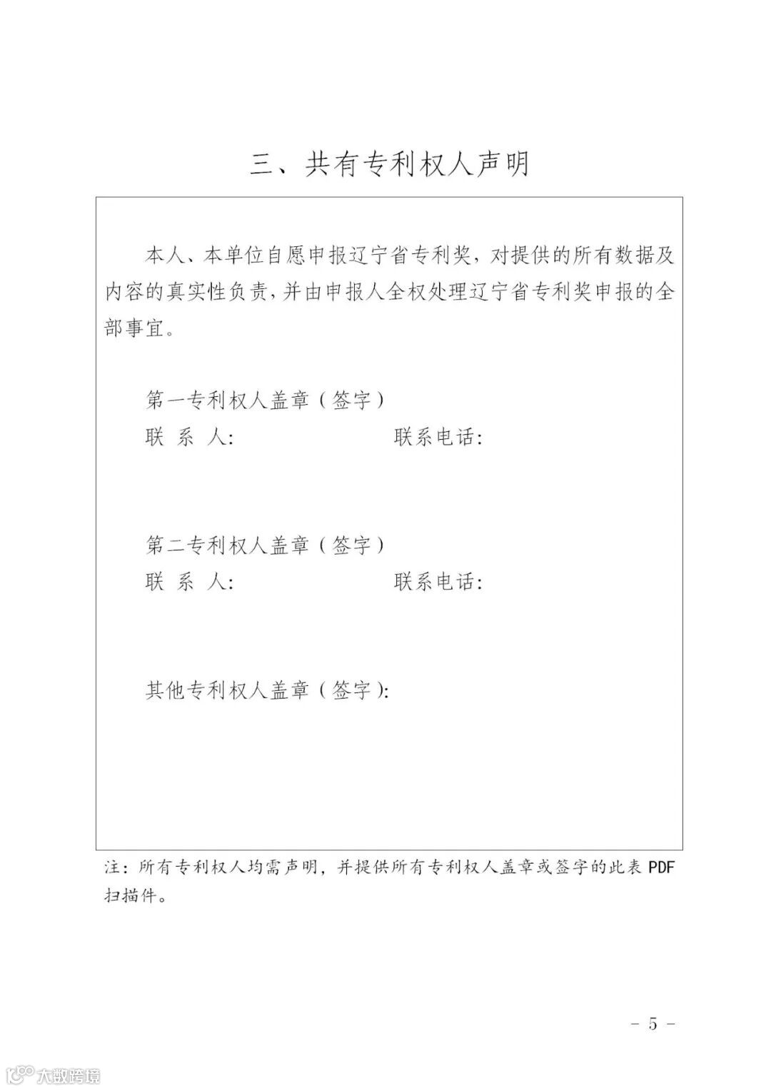 1.《辽宁省专利奖申报书》(附件2、附件3)。申报人填写完毕后,提交至推进单位或推荐人,由其对申报书内容进行审核,并填写提名推荐表。