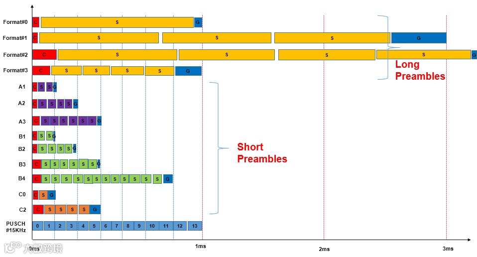 Preamble结构一般由三部分组成:Cyclic Prefix(CP) + Preamble Sequence (重复) + Guard Period(GP),其中核心部分preamble sequence可能重复多次,取决于不同的format。