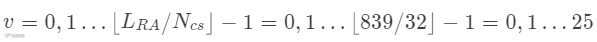 Ncs由参数zeroCorrelationZoneConfig = 6查表所得。根据参数prach-ConfigurationIndex = 2可以查表得到preamble format是format 0。format 0的子载波间隔是1.25kHz。因此通过下表可以得到Ncs=32。根据上面的公式知道v的取值如下