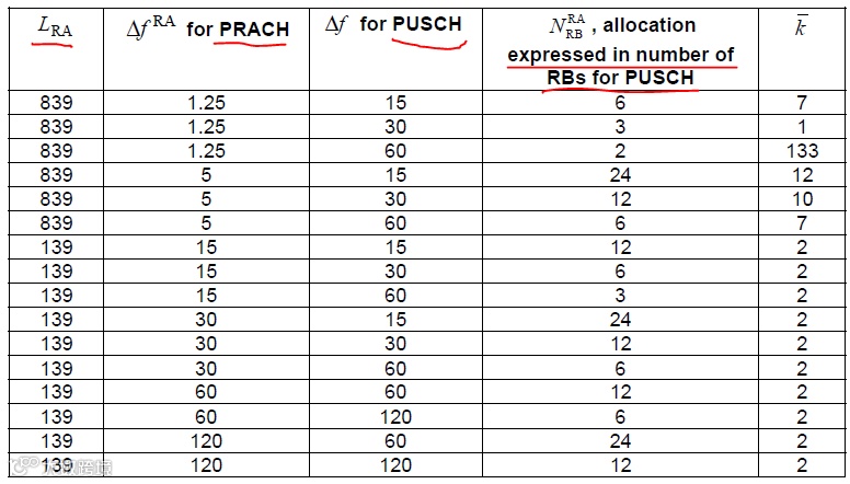 上面介绍了时域长度,下面看看频域占多少RB。下面这个摘自38211的table总结了NR支持的PRACH和PUSCH的子载波间隔SCS的不同组合,以及每种组合下的频域占多少个RB。