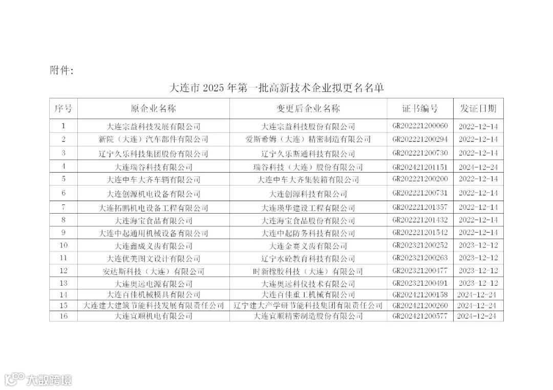 保呈快讯内容:关于《关于公示大连市2025年第一批拟更名高新技术企业名单的通知》-内容分享