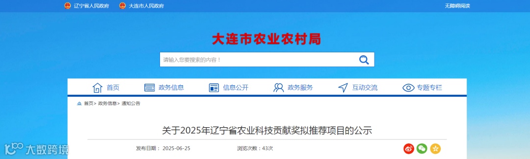 按照《辽宁农业科技贡献奖管理办法》《辽宁农业科技贡献奖管理办法实施细则》有关要求,经各申报单位自愿申报、专家评审,拟推荐以下5个项目申报2025年辽宁省农业科技贡献奖,现将项目基本信息予以公示,公示期为2025年6月25-29日,公示期如有异议请反馈至大连市农业农村局。