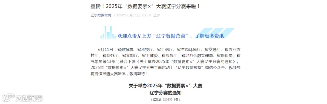 为全面贯彻落实党的二十届三中全会精神和中央经济工作会议精神,落实《中共中央 国务院关于构建数据基础制度更好发挥数据要素作用的意见》,加快推进《“数据要素×”三年行动计划(2024—2026年)》,充分发挥数据要素乘数效应,赋能经济社会高质量发展,按照国家数据局等部门《关于举办2025年“数据要素×”大赛的通知》要求,辽宁省数据局等有关部门共同举办2025年“数据要素×”大赛辽宁分赛。现将有关事项通知如下。