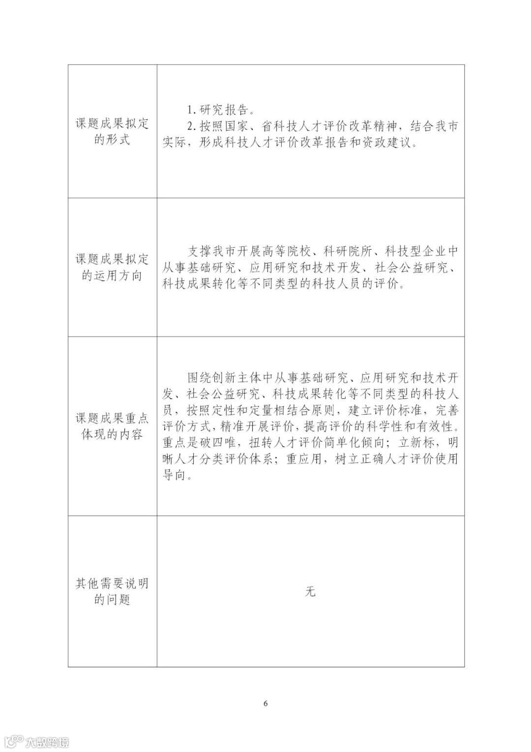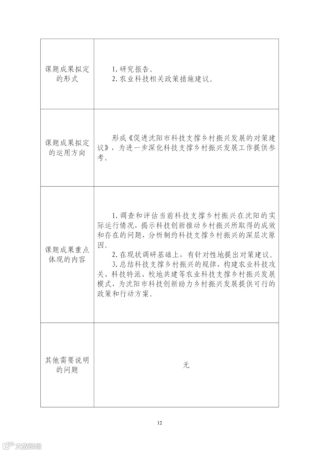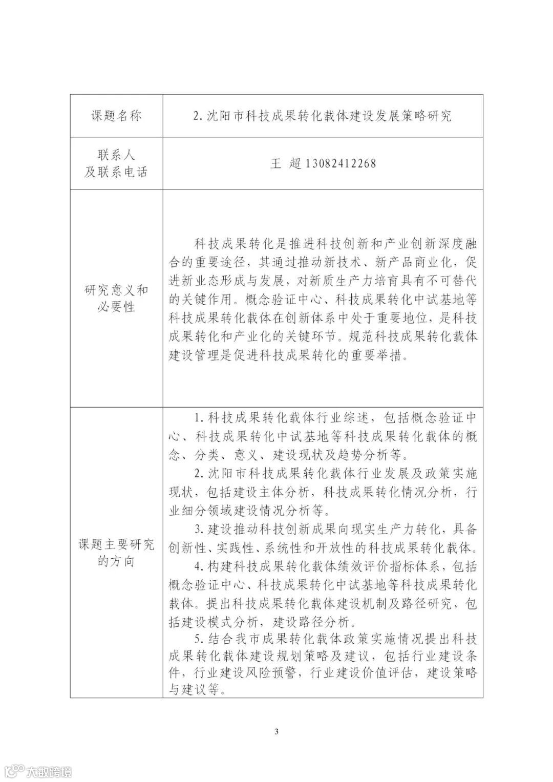 2.申报项目名称仅可填写指南表中课题名称之一,填写其他课题无效。课题名称包括:“集成创新资源推进关键核心技术协同攻关路径研究”、“沈阳市科技成果转化载体建设发展策略研究”、“关于沈阳市科技人才分类评价改革机制研究”、“沈阳市科技安全风险研判及对策研究”、“沈阳市科学技术服务业发展现状及对策研究”、“科技支撑沈阳市乡村振兴发展对策研究”、“沈阳市国际科技合作现状及发展对策研究”。