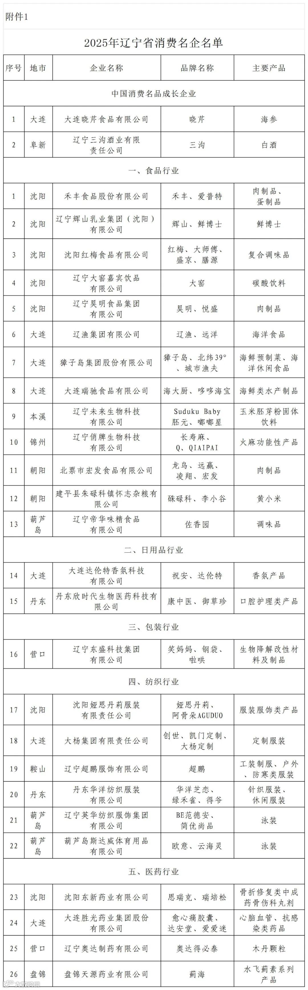为推动我省消费品工业高质量发展,根据《工业和信息化部办公厅关于分级打造中国消费名品方阵的通知》(工信厅消费函〔2024〕369号)和《辽宁省工业和信息化厅关于开展2025年辽宁省消费名企名品方阵推荐工作的通知》,经企业申报、各市推荐、专家评审和网上公示,形成了《2025年辽宁省消费名企名品目录》,现予以发布。