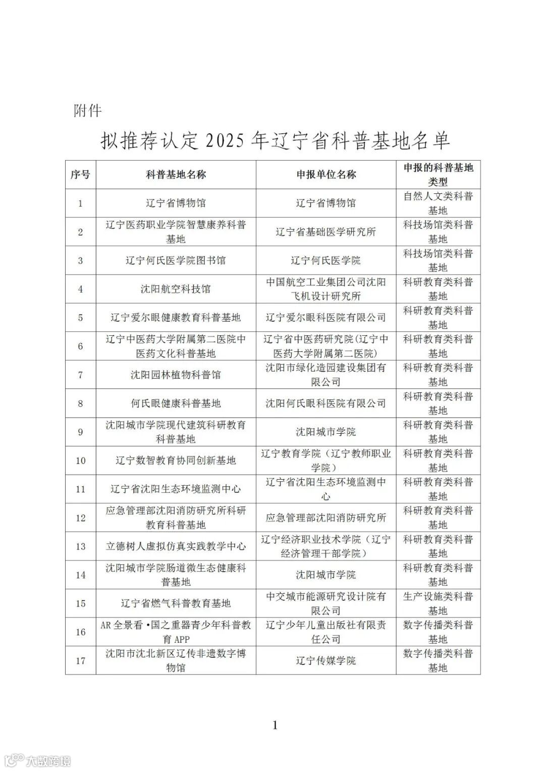 附件:拟推荐认定2025年辽宁省科普基地名单