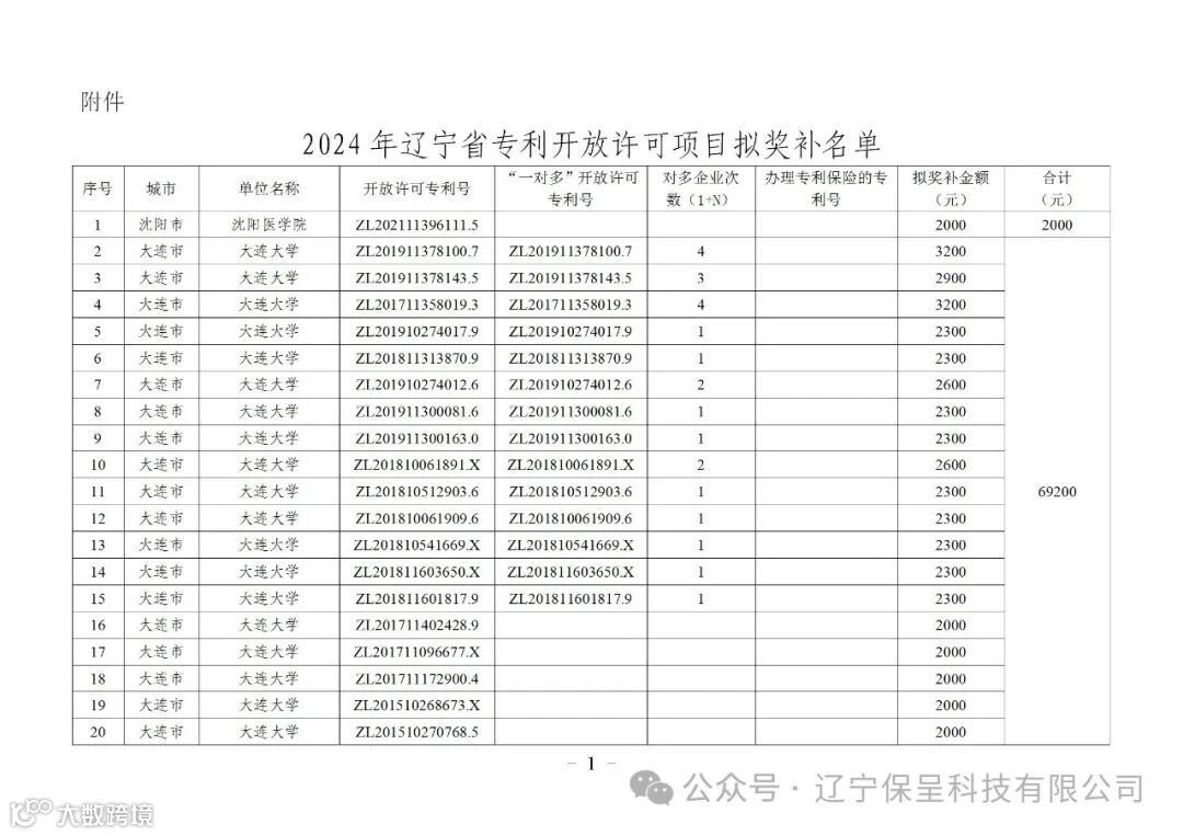 保呈快讯内容:关于《关于2024年辽宁省专利开放许可项目拟奖补名单的公示》-内容分享