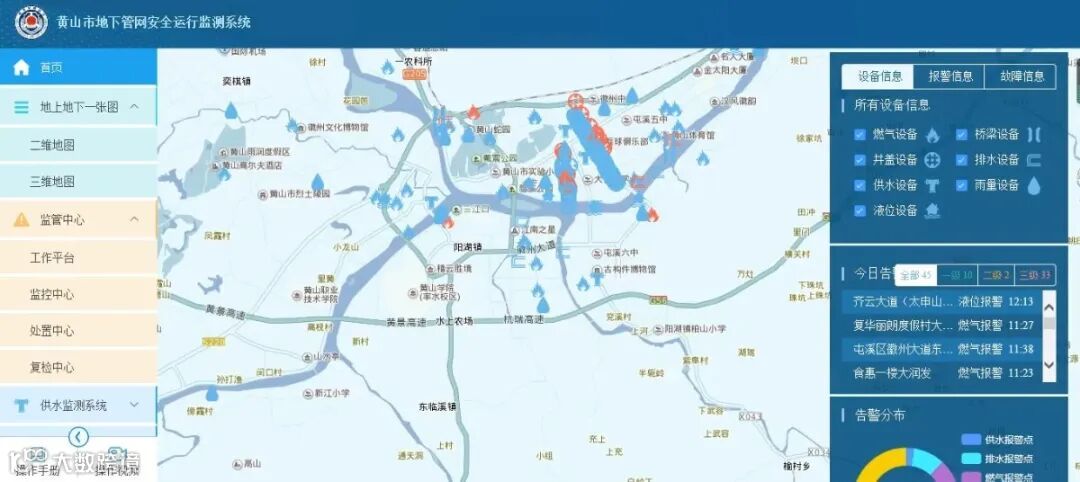 黄山市地下管网安全运行监测系统,通过物联网的采集终端、集成接入中心监管系统实现对城市管网的智能化管控,系统建立在基础业务需求和流程之上,建设内容涉及燃气、供水、排水、桥梁以及井盖监测等。
