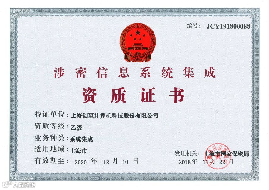 上海创至计算机科技股份有限公司(股票代码:839736,以下简称:创至股份)继荣获“涉密信息系统集成乙级资质(软件开发)”后,于2018年11月22日获得由上海市国家保密局颁发的“涉密信息系统集成乙级资质(系统集成)”证书。