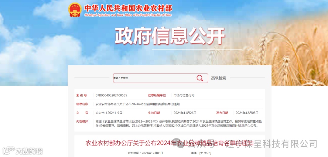 保呈快讯内容:关于《农业农村部办公厅关于公布2024年农业品牌精品培育名单的通知》-内容分享