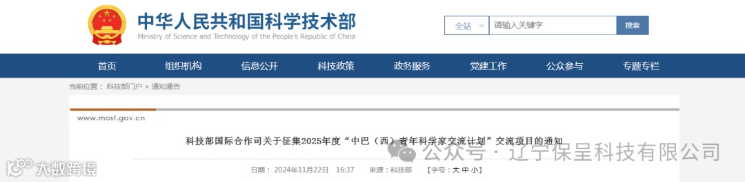 保呈快讯内容:关于《科技部国际合作司关于征集2025年度“中巴(西)青年科学家交流计划”交流项目的通知》-内容分享
