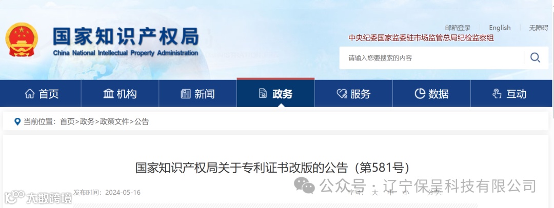 保呈快讯内容:关于《国家知识产权局关于专利证书改版的公告(第581号)》-内容分享