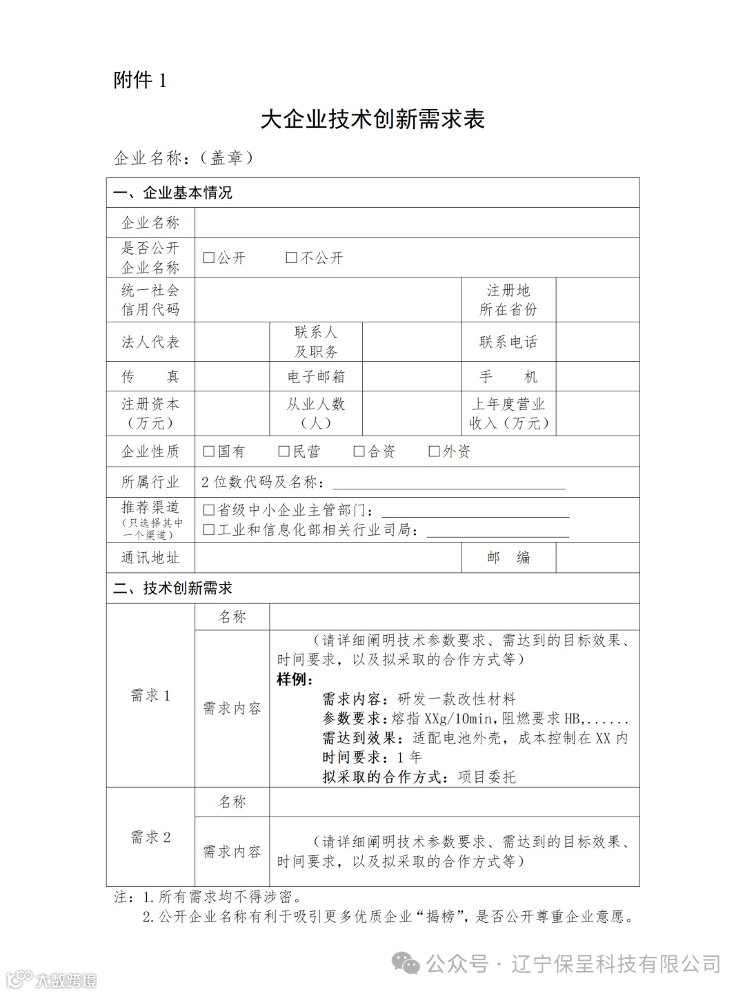 (一)征集大企业需求。各省、自治区、直辖市及计划单列市、新疆生产建设兵团中小企业主管部门(以下统称省级中小企业主管部门)、工业和信息化部相关司局组织动员本地区、本行业有一定龙头带动作用的大企业,参考《产业基础创新发展目录》、结合自身发展实际,提出拟请中小企业“揭榜”攻关的技术创新需求。有“发榜”意愿的大企业在大中小企业融通创新平台(http://xieshouxingdong.cn)填写《大企业技术创新需求表》(见附件1,可选择是否公开企业名称),下载打印纸质版并加盖企业公章,可通过两个渠道报送:一是由省级中小企业主管部门组织联系的大企业,报送至所在地省级中小企业主管部门。省级中小企业主管部门初核后,2024年7月12日前通过邮政快递(EMS)寄至工业和信息化部。二是由工业和信息化部相关司局组织联系的大企业,2024年7月12日前通过邮政快递(EMS)直接寄至工业和信息化部。工业和信息化部将结合需求的可行性等情况,筛选形成大企业技术创新需求目录,通过全国大中小企业融通创新服务平台向社会公开发布。