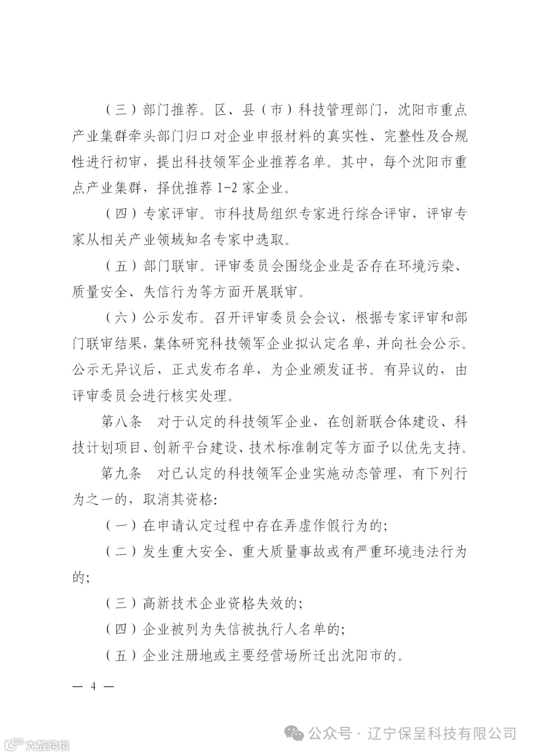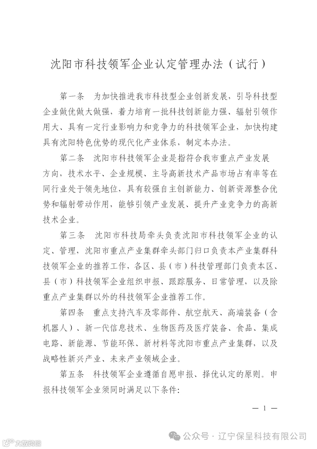 保呈快讯内容:关于《沈阳市科学技术局关于印发《沈阳市科技领军企业认定管理办法(试行)》的通知》-内容分享