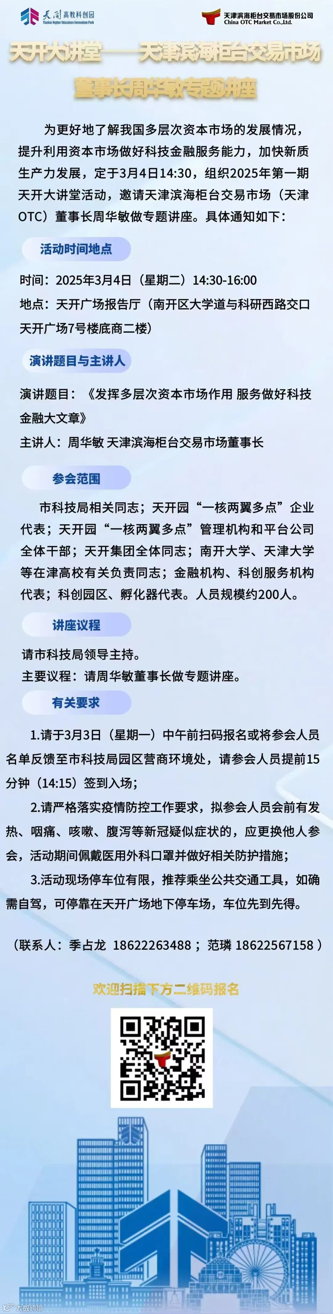天开大讲堂——天津滨海柜台交易市场董事长周华敏专题讲座|OTC邀请