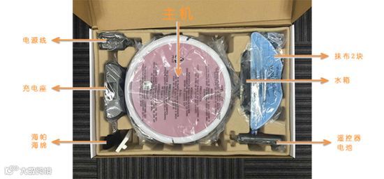 ▲翻盖式的彩盒包装,里面还有一层纸板盖住,机器上方有泡沫板保护主机,防震效果不错。除了表面上放的这些配件以外,主机下面还放了4个边刷,具体有哪些配件,对着说明书看了下。总体来说,配件还是很全面的:2节电池、1个遥控器、1个清理小工具、1块海帕、1块海绵、2块抹布、1根电源线、4个边刷(这里只拍了2个,2个是一组)。