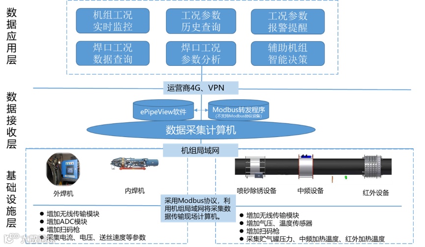 而施工管理作为智能管道建设的工作内容之一,为满足智慧管道建设“全数字化移交”要求,确保施工阶段数据采集的真实、准确、完整、及时,针对传统施工数据采集存在的数据缺失、采集滞后和工艺执行验证难等难题,龙慧公司经过技术公关,成功研究了全自动焊机工况参数自动采集及预警分析技术。